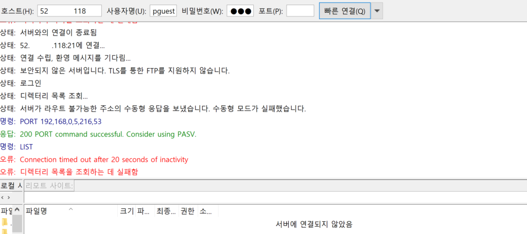 ftp접속과 명령어에 사용되는 포트는 21번이며 실제 데이터전송에 사용되는 기본포트는 20번입니다. 이때 20번포트의 데이터전송 연결을 허용할 것인가, 허용하지 않을 것인가 설정합니다.