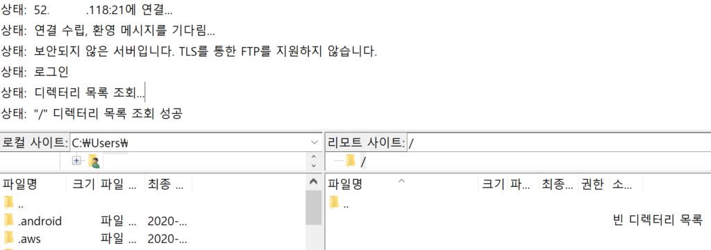 위 설정을 통해 상위 디렉토리로 접근을 하지 못하게 하며, FTP 접근이 가능하게 되었습니다.