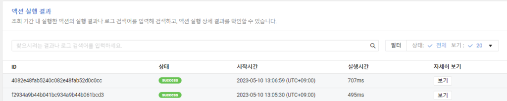 생성된 Action을 [실행]하여 정상적으로 실행되는지 확인합니다.