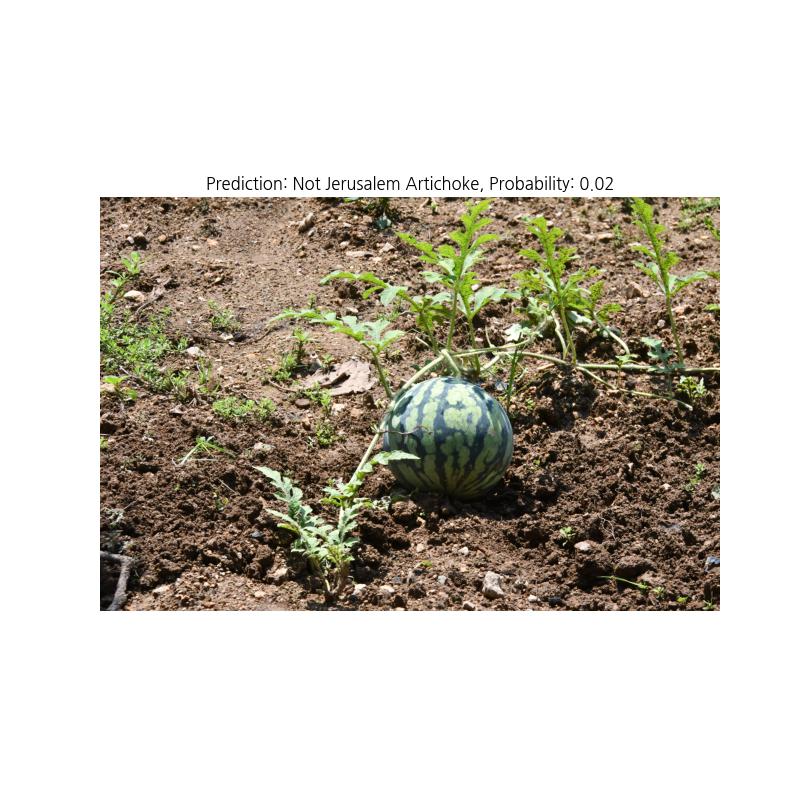 - 돼지감자 외 다른 것(수박)을 not_helianthus_tuberosus 데이터로 함께 학습한 결과 돼지감자와 다른 것(수박)을 구분할 수 있다. 즉, 수박은 돼지감자가 아니라고 명확하게 구분한다.