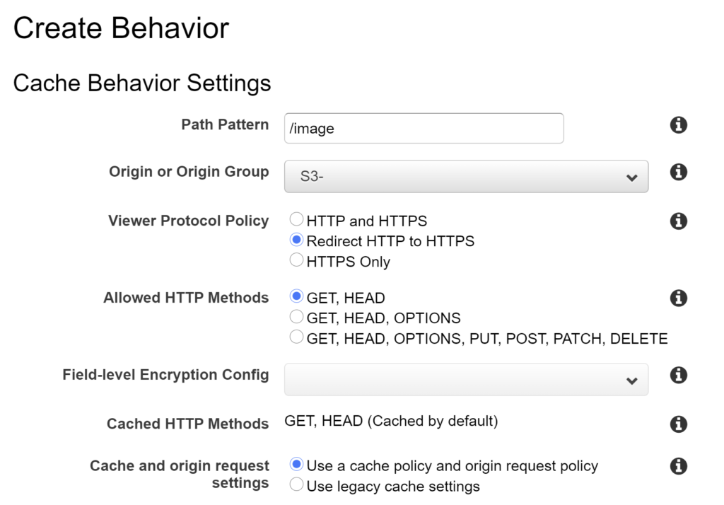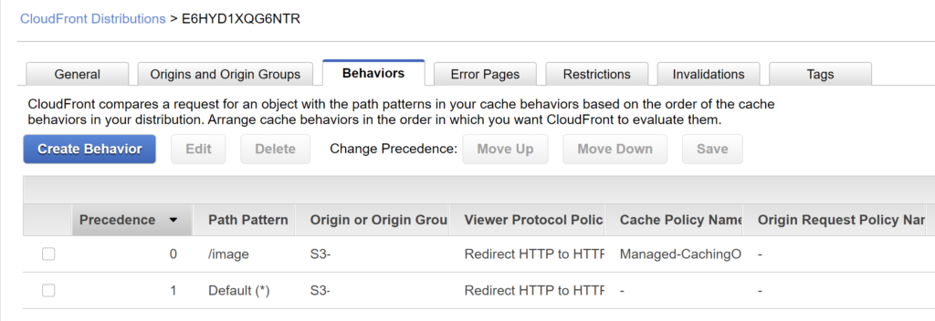 생성된 Cloudfront에서 Behaviors를 이용하면 S3 버킷내에 디렉토리 별로 옵션 설정이 가능합니다.