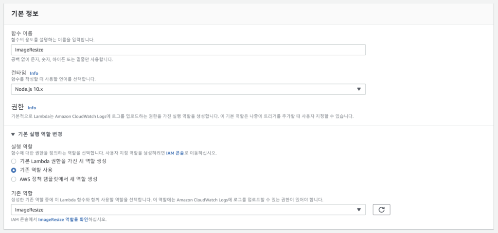 위 그림과 동일하게 이름/버전/역할을 정해준 뒤 [함수 생성]을 클릭해줍시다.