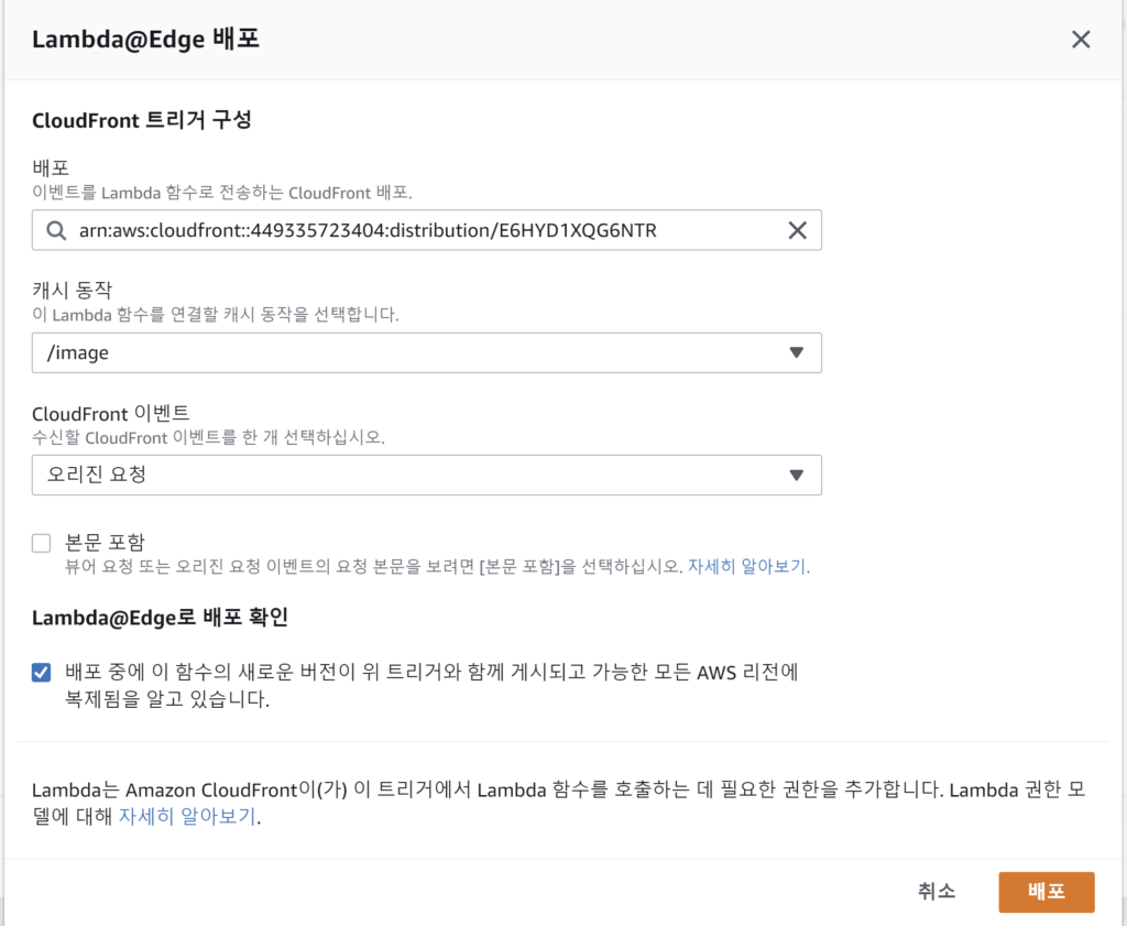 [AWS Lambda] – [생성했던 함수] – [작업] – [Lambda@Edge 배포]