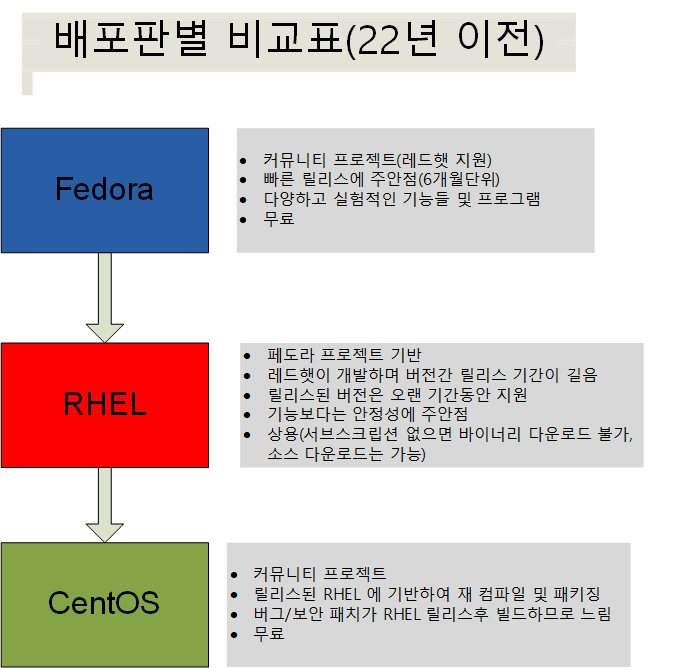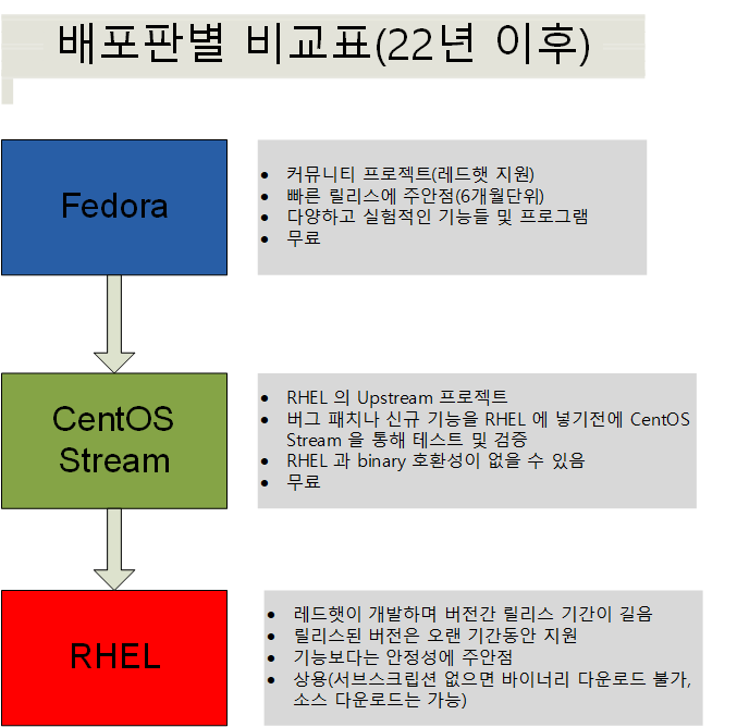 CentOS 가 종료되고 CentOS Stream 로 전환되는 22년부터는 아래와 같은 관계가 됩니다.
