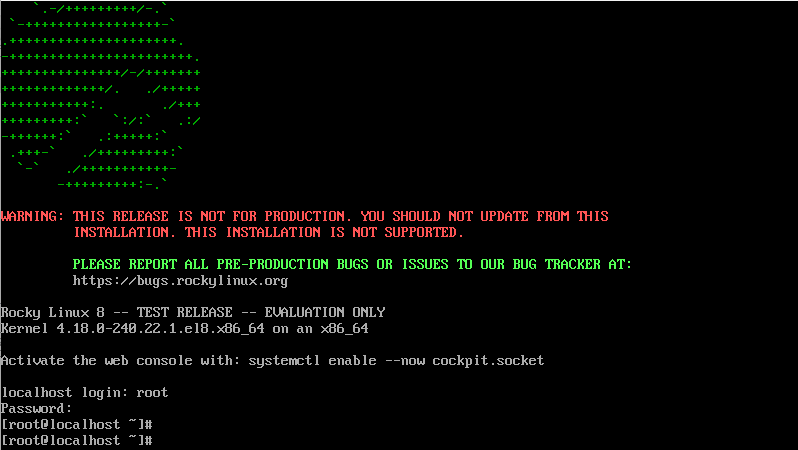설치 및 부팅 후 CLI 콘솔 화면에서 Rocky 로고가 나옵니다.