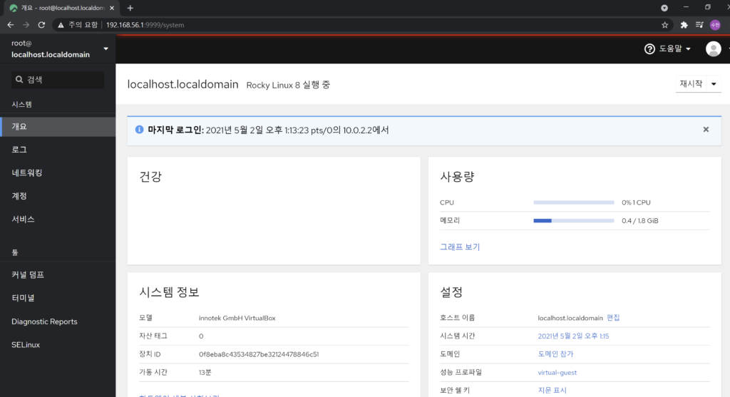 Rocky Linux 설치 시 cockpit이 설치가 되어있나봅니다.