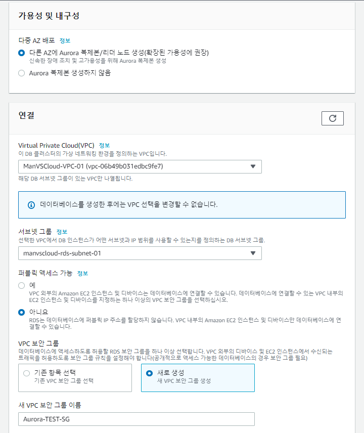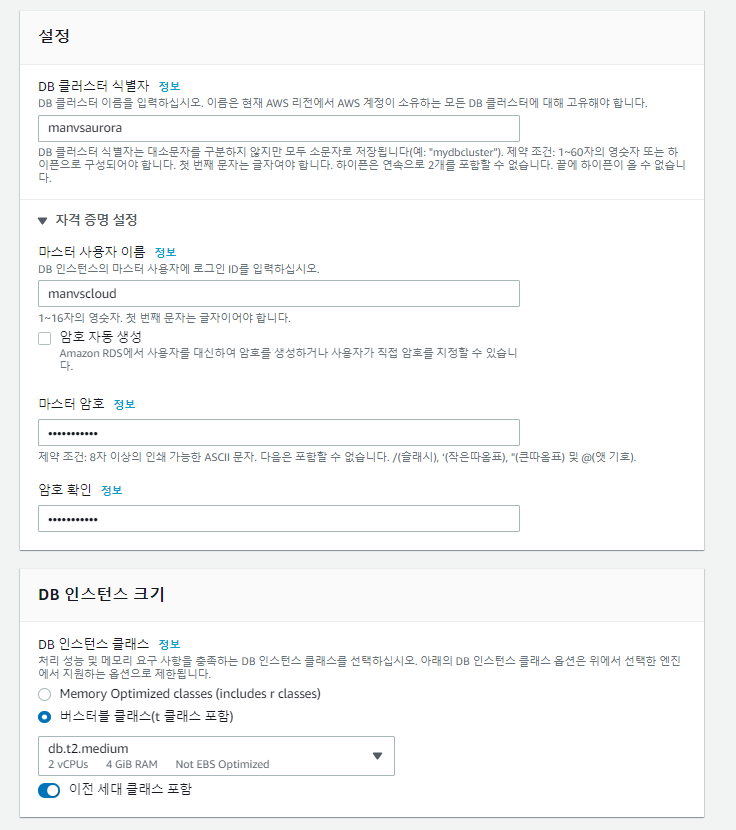 버전은 Aurora (MYSQL 5.7) 2.07.2로 하였으며 DB 생성은 위와 같이 생성하였습니다.