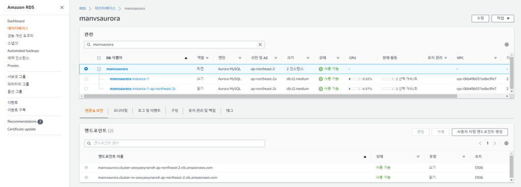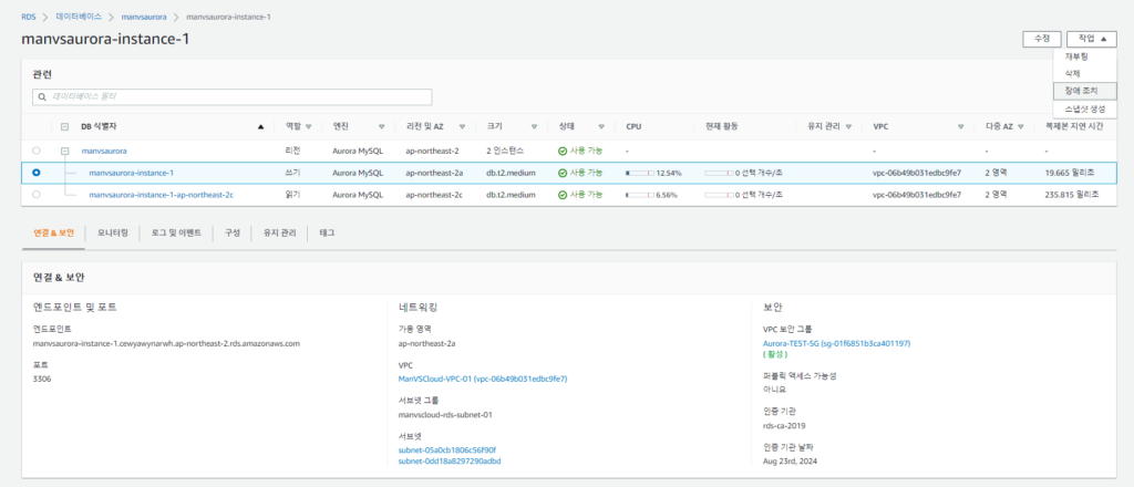 AWS 콘솔로 돌아가 AURORA DB 장애조치를 시작해보겠습니다.