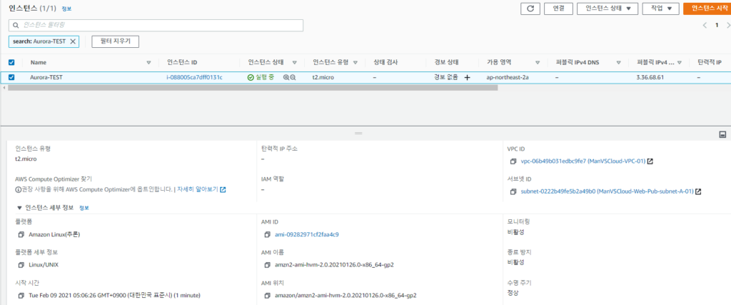 AURORA DB 생성 후 테스트용 EC2를 추가로 생성하였습니다.