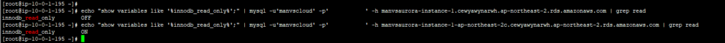 AZ2A=$(echo "show variables like '%innodb_read_only%';" | mysql -u'manvscloud' -p'PW' -h manvsaurora-instance-1.cewyawynarwh.ap-northeast-2.rds.amazonaws.com | grep read | awk '{print $2}')
