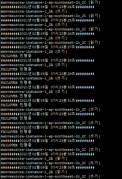 또한 사진을 보시다시피 2C 가용 영역의 인스턴스가 FAILOVER가 진행되고 얼마 지나지 않아 [쓰기] 상태로 변하고 2A 가용 영역의 인스턴스가 FAILOVER 상태가 되며 [읽기] 상태로 변하게 된 것을 확인할 수 있었습니다.
