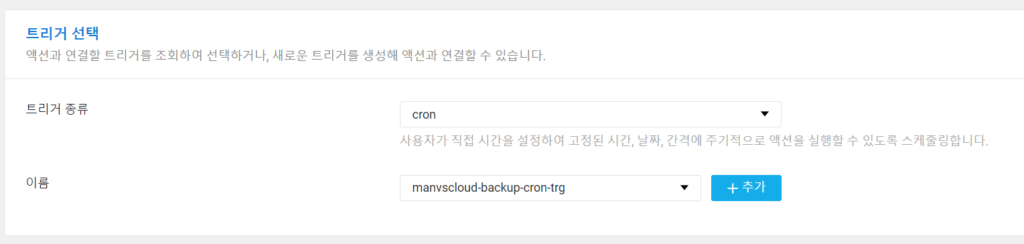 트리거 선택 시 위에서 생성한 cron 트리거를 선택하여 추가해줍니다.