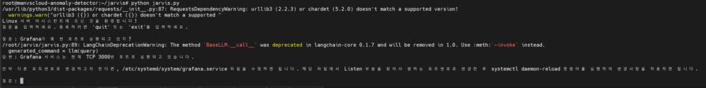 예를 들어 “Grafana가 몇 번 포트로 실행되고 있지?”라는 질문에 대해 “netstat -nltp | grep grafana”와 같이 명령어를 생성하도록 하고 실행 결과를 바탕으로 “Grafana는 현재 3000번 포트에서 실행 중입니다.”와 같이 자연스러운 대화체로 응답하도록 구현했습니다.