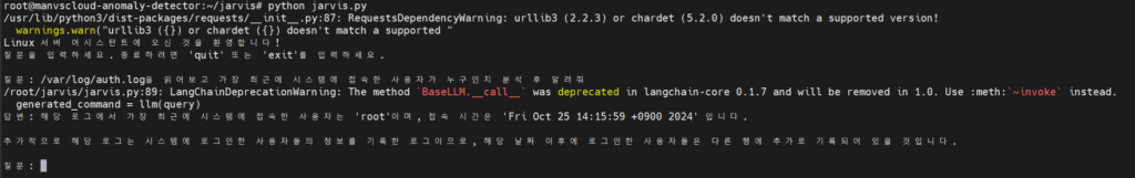 • “/var/log/auth.log을 읽어보고 가장 최근에 시스템에 접속한 사용자가 누구인지 분석 후 알려줘”
