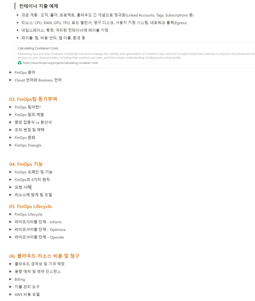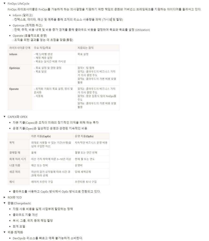 위 이미지는 FinOps를 공부하며 Notion에 정리한 내용의 일부입니다.