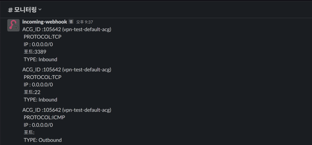 위 Cloud Functions 생성 과정을 마친 후 Action 실행 시 0.0.0.0/0 정책이 있을 경우 아래와 같이 Slack을 통해 알림을 받을 수 있습니다.