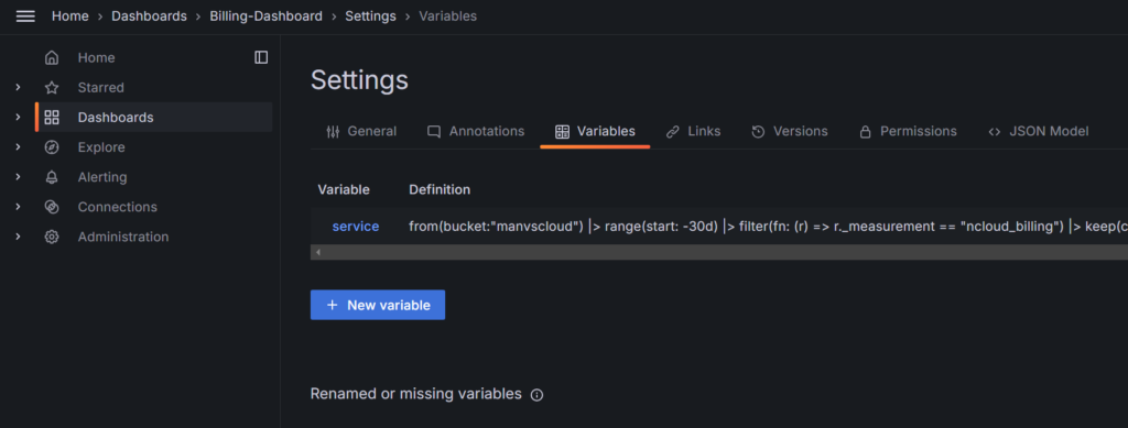 위 예시들과 같이 대시보드로 서비스별 비용을 확인하고자 한다면 아래와 같이 Dashboard의 Settings에서 Variables를 설정해주시기 바랍니다.