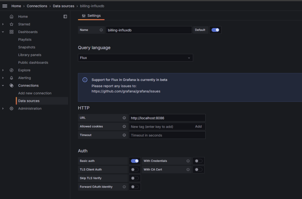 3. InfluxDB의 URL, 데이터베이스 이름, 사용자 이름, 비밀번호 등을 입력합니다.