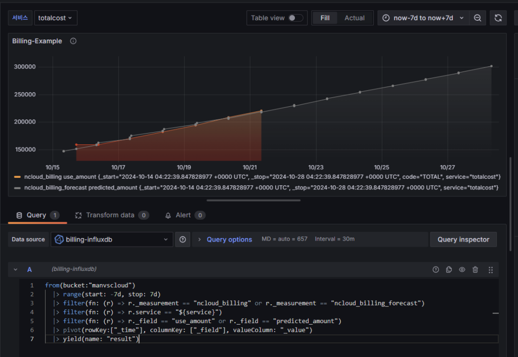 3. InfluxDB 쿼리를 작성하여 원하는 비용 데이터를 가져옵니다.