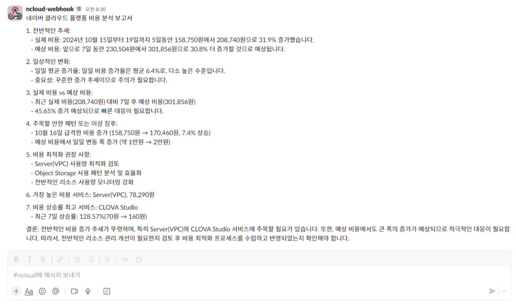 2. 생성형 AI (HCX003)를 활용한 자동화된 비용 보고서 생성 및 Slack Webhook 전달