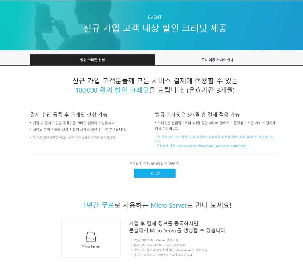 네이버 클라우드 역시 가입 시 크레딧 제공과 함께 micro 서버 1대를 1년간 무료로 사용할 수 있도록 해주었는데요.